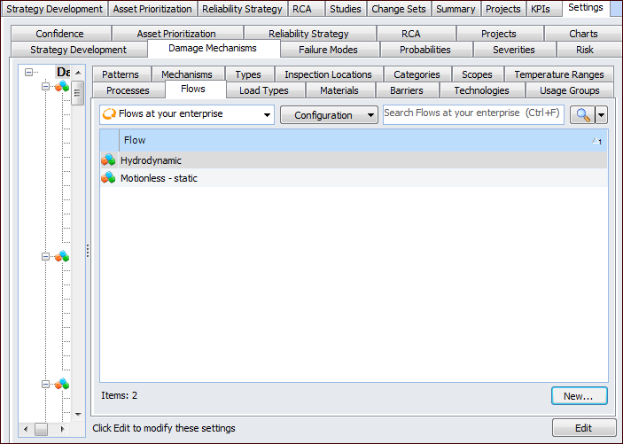 1. On the site’s Strategy Development view, select the Settings tab. Select the Damage Mechanisms tab and the Damage mechanisms settings node in the tree.Tip: You can also select the site’s Administration menu, Strategy Development Settings, and then Damage Mechanism Library. The Damage Mechanisms Management Settings dialog appears.