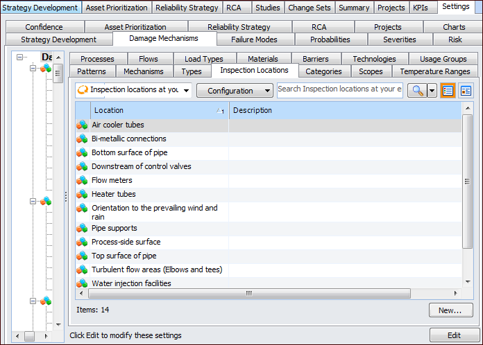 1. On the site’s Strategy Development view, select the Settings tab. Select the Damage Mechanisms tab and the Damage mechanisms settings node in the tree.Tip: You can also select the site’s Administration menu, Strategy Development Settings, and then Damage Mechanism Library. The Damage Mechanisms Management Settings dialog appears.
