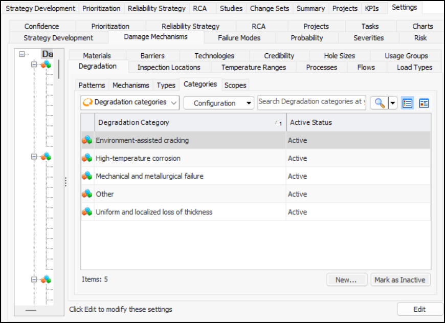 1. On the site’s Strategy Development view, select the Settings tab. Select the Damage Mechanisms tab and the Damage mechanisms settings node in the tree.Tip: You can also select the site’s Administration menu, Strategy Development Settings, and then Damage Mechanism Library. The Damage Mechanisms Management Settings dialog appears.