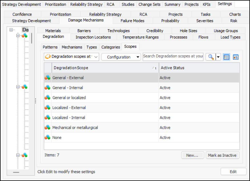 1. On the site’s Strategy Development view, select the Settings tab. Select the Damage Mechanisms tab and the Damage mechanisms settings node in the tree.Tip: You can also select the site’s Administration menu, Strategy Development Settings, and then Damage Mechanism Library. The Damage Mechanisms Management Settings dialog appears.