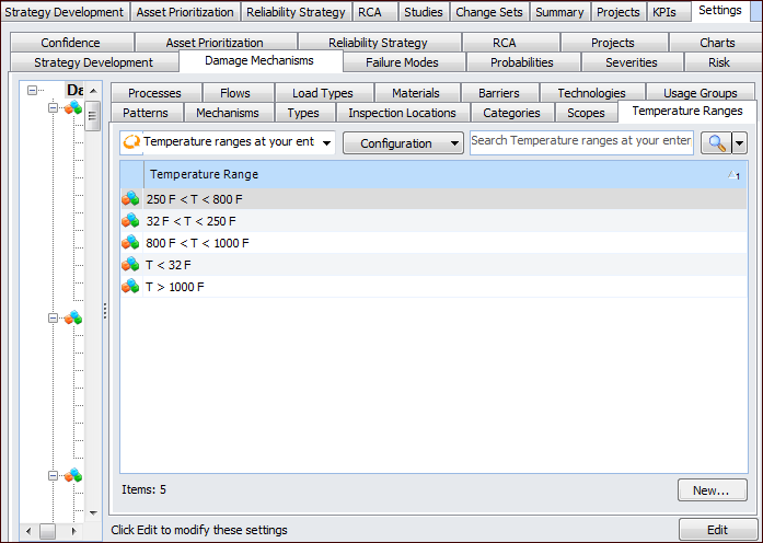 1. On the site’s Strategy Development view, select the Settings tab. Select the Damage Mechanisms tab and the Damage mechanisms settings node in the tree.Tip: You can also select the site’s Administration menu, Strategy Development Settings, and then Damage Mechanism Library. The Damage Mechanisms Management Settings dialog appears.