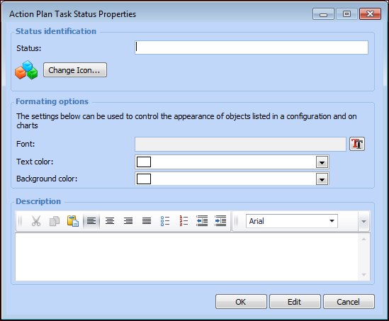 3. For each of the action plan task statuses required by your organization, click New. The Action Plan Task Status Properties dialog appears.