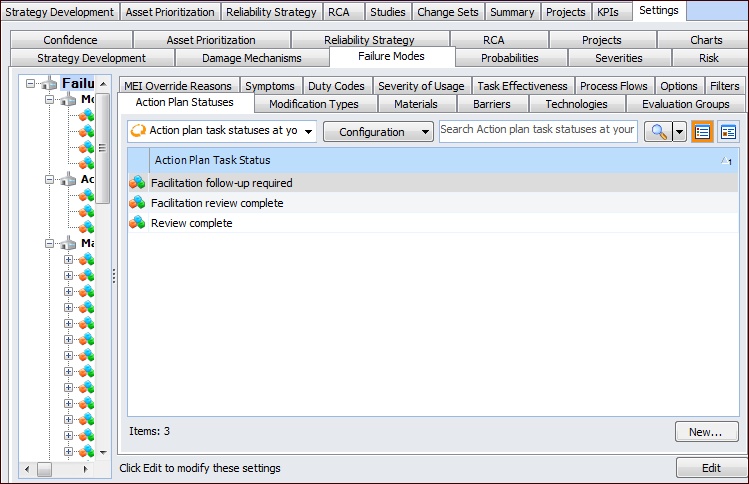 1. On the site’s Strategy Development view, select the Settings tab. Select the Failure Modes tab and the Failure mode settings node in the tree.Tip: You can also select the site’s Administration menu, Strategy Development Settings, and then Failure Modes. The Failure Mode Management Settings dialog appears.