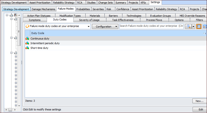 1. On the site’s Strategy Development view, select the Settings tab. Select the Failure Modes tab and the Failure mode settings node in the tree.Tip: You can also select the site’s Administration menu, Strategy Development Settings, and then Failure Modes. The Failure Mode Management Settings dialog appears.