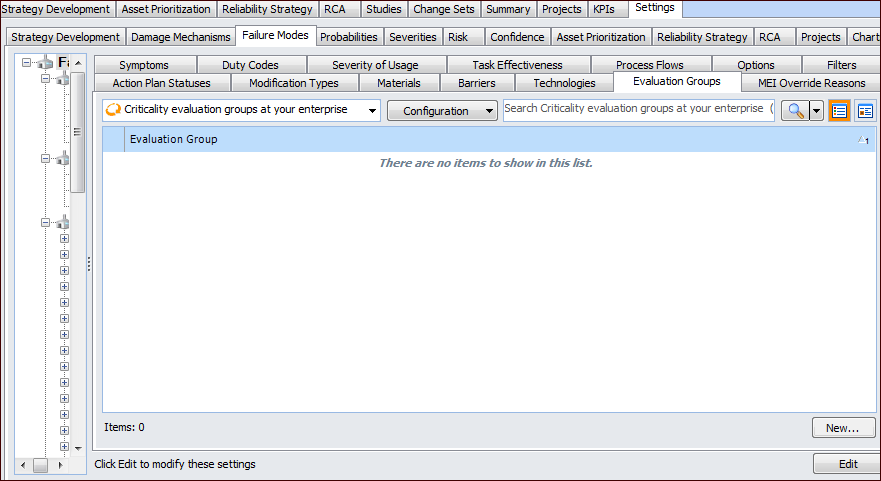 1. On the site’s Strategy Development view, select the Settings tab. Select the Failure Modes tab and the Failure mode settings node in the tree.Tip: You can also select the site’s Administration menu, Strategy Development Settings, and then Failure Modes. The Failure Mode Management Settings dialog appears.