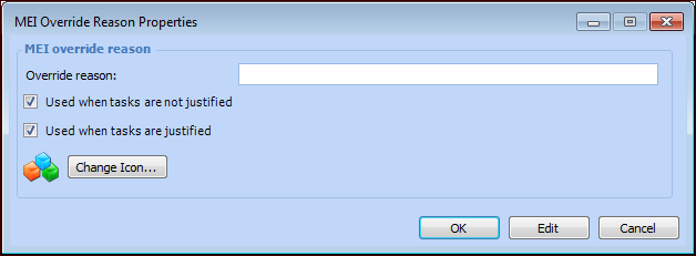 3. Click New. The MEI Override Reason Properties dialog appears.