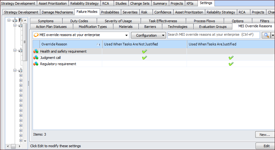 1. On the site’s Strategy Development view, select the Settings tab. Select the Failure Modes tab and the Failure mode settings node in the tree.Tip: You can also select the site’s Administration menu, Strategy Development Settings, and then Failure Modes. The Failure Mode Management Settings dialog appears.