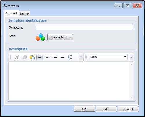 7. Click OK to close the dialog. The symptom appears in the tab.Tip: When the symptom is in use, you can return to this dialog and select the Usage tab. It lists the failure modes that reference the symptom.