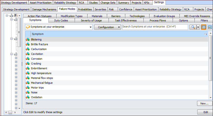 1. On the site’s Strategy Development view, select the Settings tab. Select the Failure Modes tab and the Failure mode settings node in the tree.Tip: You can also select the site’s Administration menu, Strategy Development Settings, and then Failure Modes. The Failure Mode Management Settings dialog appears.