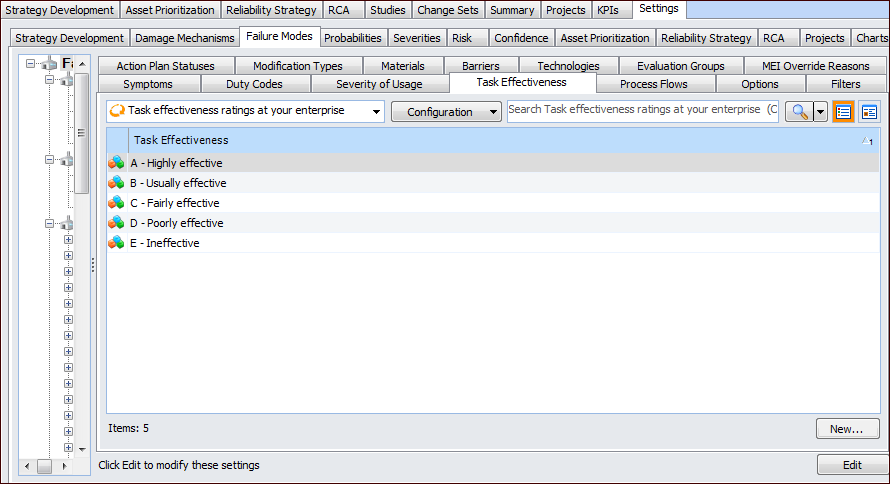 1. On the site’s Strategy Development view, select the Settings tab. Select the Failure Modes tab and the Failure mode settings node in the tree.Tip: You can also select the site’s Administration menu, Strategy Development Settings, and then Failure Modes. The Failure Mode Management Settings dialog appears.