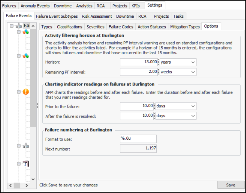 4. In the Charting indicator readings on failures area, enter the amount of time and the unit of measurement that indicator readings are charted prior to the failure’s occurrence.