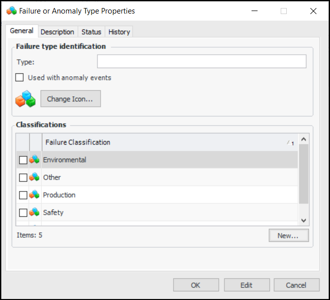 If your APM environment is configured to use AssetWise Enterprise Interoperability (AWEIS) and anomaly risk assessment integration, you can select types and classifications for anomaly events. For more information, see Setting up APM for Anomaly Risk Assessment and Integration.To Define Failure Types
