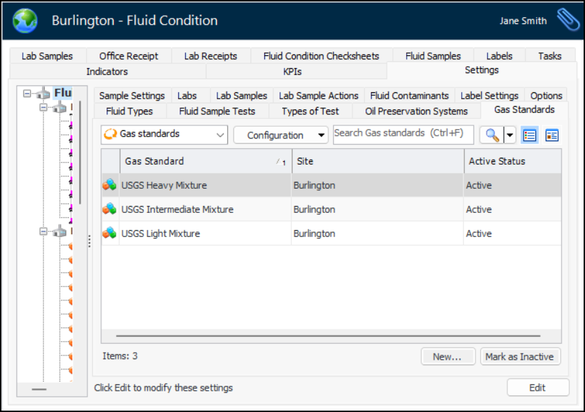 2. Select the Gas Standards tab. This tab lists the standards that have been created for the enterprise. For example:You can mark a standard as inactive until it is ready to be used. Select the standard in the table and click Mark as Inactive. The Mark as Inactive/Active dialog appears, where you can enter a comment. When you click OK, a confirmation message appears. Click OK. When you are ready, click Mark as Active to make the standard available for use.
