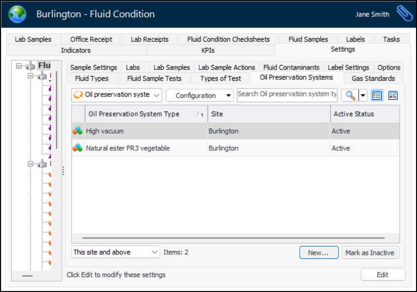 2. Select the Oil Preservation Systems tab. This tab lists the types that have been created for the site. For example:You can mark a type as inactive until it is ready to be used. Select the type in the table and click Mark as Inactive. The Mark as Inactive/Active dialog appears, where you can enter a comment. When you click OK, a confirmation message appears. Click OK. When you are ready, click Mark as Active to make the type available for use.
