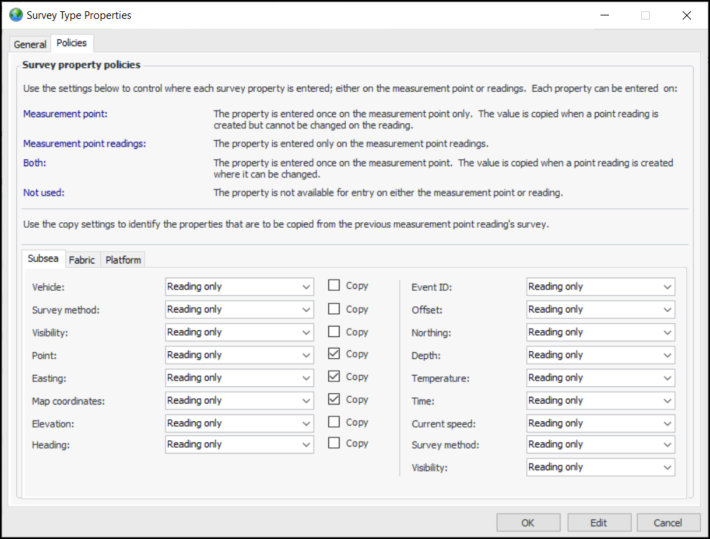 • Reading only – The property is entered only on the measurement point readingsMeasurement point only – The property is entered once on the measurement point only. The value is copied when a point reading is created but cannot be changed on the reading