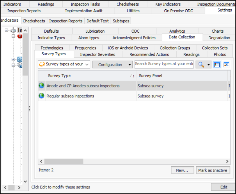 2. Select the Data Collection tab and then the Survey Types tab. This tab shows a list of the current subsea surveys:Tip: You can mark a survey type as “inactive” while it is in development. Inactive objects are not available for selection on sites. To deactivate or reactivate a survey type, select it and click Mark as Inactive or Mark as Active. The Mark as Inactive/Active dialog appears, where you can enter a comment and click OK. Click OK in the confirmation message that appears.