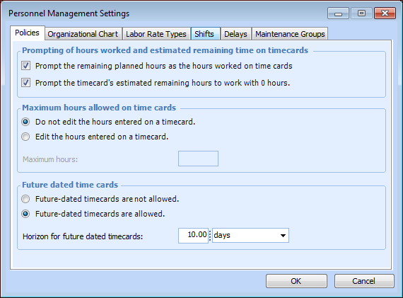 Whether or not users can enter timecards for a future date and time. If you select the option Future dated timecards are allowed, you must also enter the period of time for which users can enter future dated timecards (for example, one day or one week into the future).