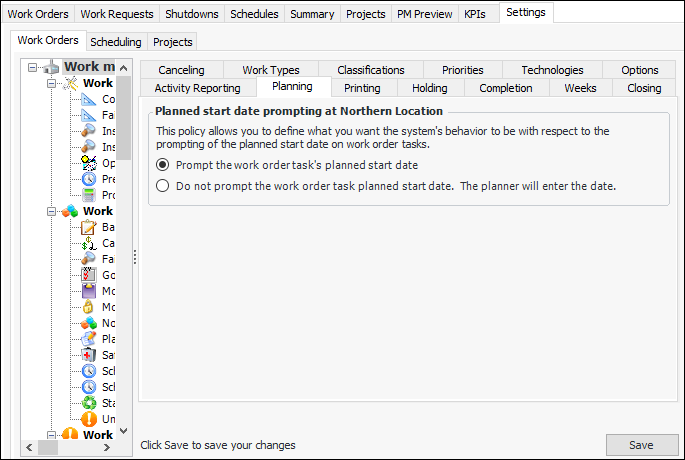 • Do not prompt the work order task’s planned start date: The system leaves the planned start date blank, and the planner must enter a date. A warning message is displayed if the planned start date is blank when the task is saved.