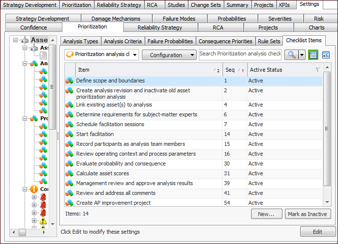 1. From the Site window, select the Strategy Development view, Settings tab. Select the Prioritization tab and the Asset prioritization settings node in the tree.Tip: You can also select the Administration menu, Strategy Development Settings, and then Asset Prioritization. The Asset Prioritization Settings dialog appears.