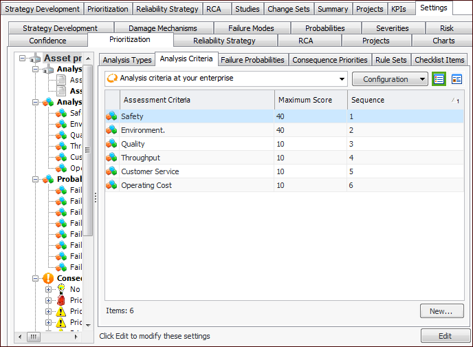 1. From the Site window, select the Strategy Development view, Settings tab. Select the Prioritization tab and the Asset prioritization settings node in the tree.Tip: You can also select the Administration menu, Strategy Development Settings, and then Asset Prioritization. The Asset Prioritization Settings dialog appears.