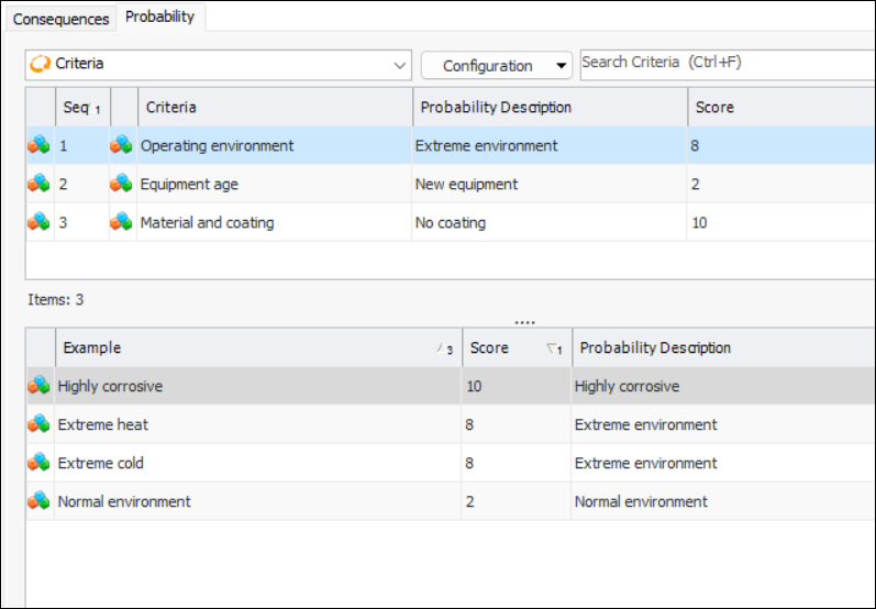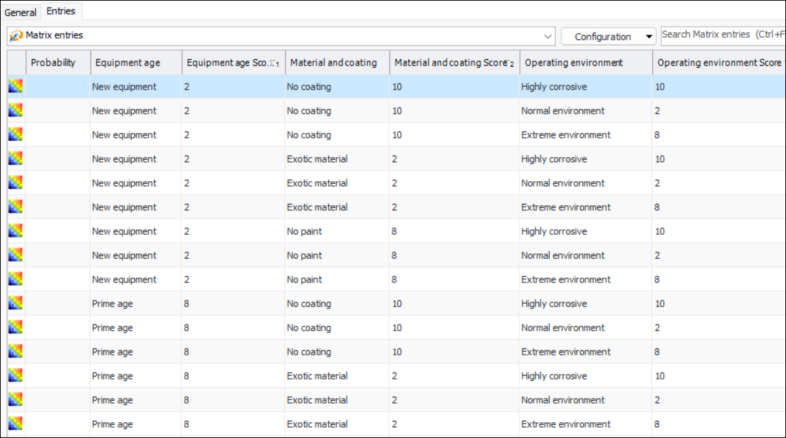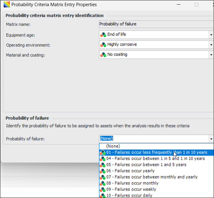 Note: To use this functionality in APM, you must first enable feature 39. In the Enterprise window, select the Customization Center view and the Enabled Features tab. Click Browse, select “Criteria based probability evaluation on an asset prioritization analysis”, and click OK. If APM is running as a smart client, click Refresh Enabled Features on the server. Then restart the client to use the functionality.Example of a Matrix