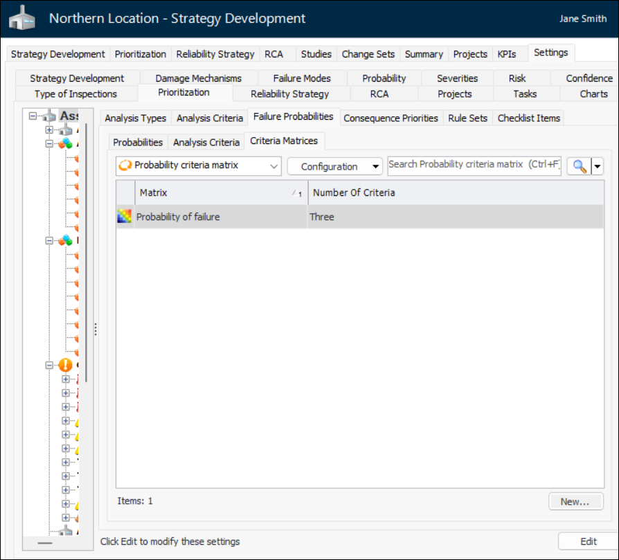 1. From the Site window, select the Strategy Development view, Settings tab. Select the Prioritization tab and the Asset prioritization settings node in the tree.Tip: You can also select the Administration menu, Strategy Development Settings, and then Asset Prioritization. The Asset Prioritization Settings dialog appears.