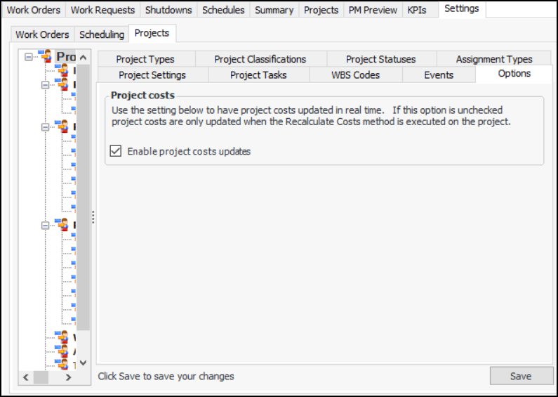 1. From the Site window, select the Work Management view and the Settings tab. Select the Projects tab and the Project management settings node in the tree.Tip: You can also work with project settings in the Strategy Development, Reliability Program, or Performance Management views. Select the Settings tab and then the Projects tab.