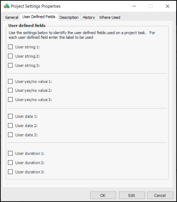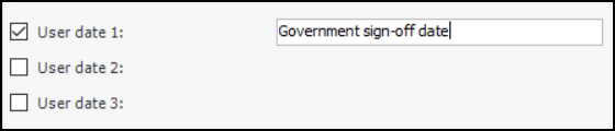 6. For each field you wish to define, click the check box for the type of data, for example, User date 1. A box appears next to the item. Enter the label that will appear in the project task. For example: