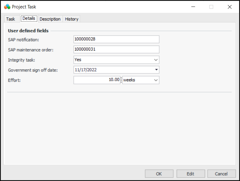 • Here is an example of a project task, Details tab showing user-defined fields:To Set up a Project Settings Profile