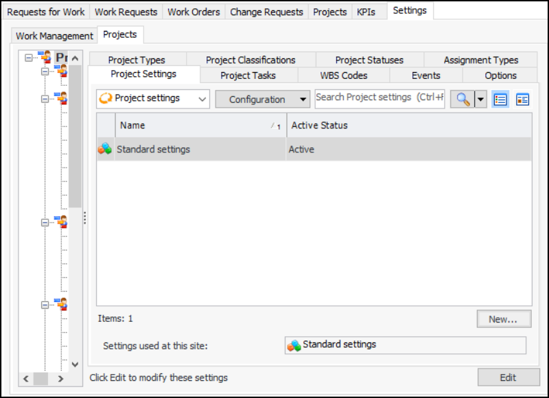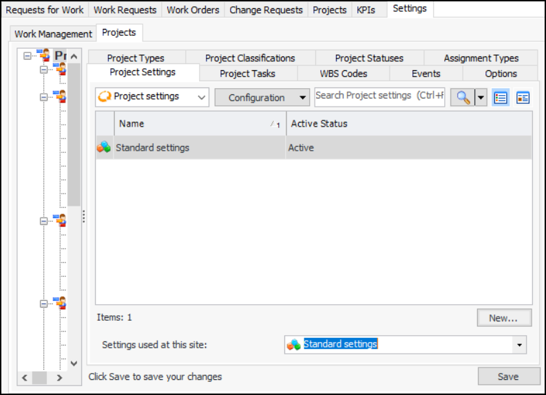 1. From the Site window, select the Work Management view and the Settings tab. Select the Projects tab and the Project management settings node in the tree.Tip: You can also work with project settings in the Strategy Development, Reliability Program, or Performance Management views. Select the Settings tab and then the Projects tab.