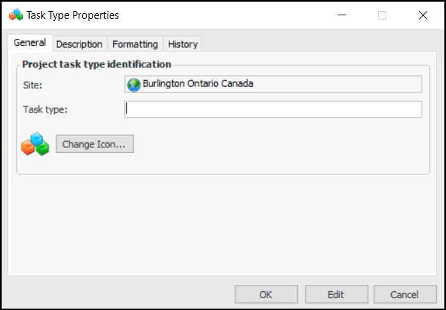3. Click New. The Task Type dialog appears:The Site box displays the current site.