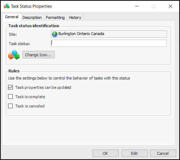 2. Click New. The Task Status dialog appears:The Site box displays the current site.