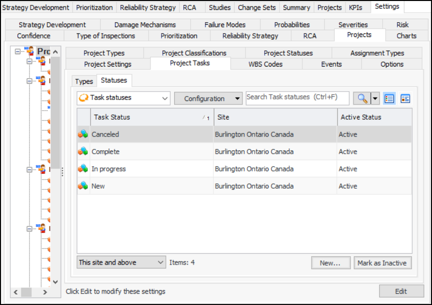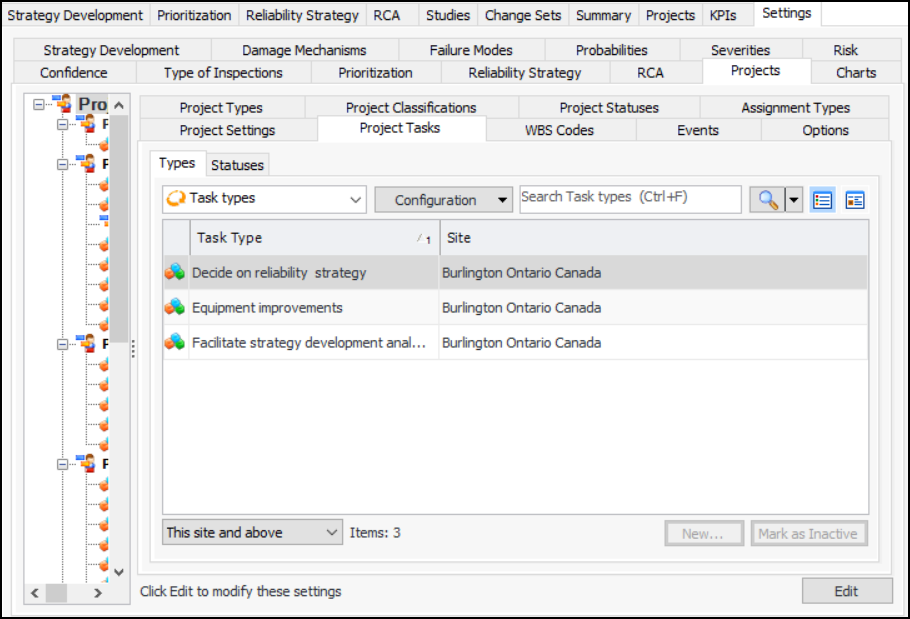 1. From the Site window, select the Strategy Development view and the Settings tab. Select the Projects tab and the Project management settings node in the tree.Tip: You can also work with project settings in the Reliability Program, Performance Management, or Work Management views. Select the Settings tab and then the Projects tab.