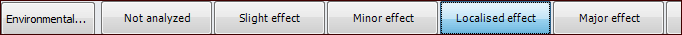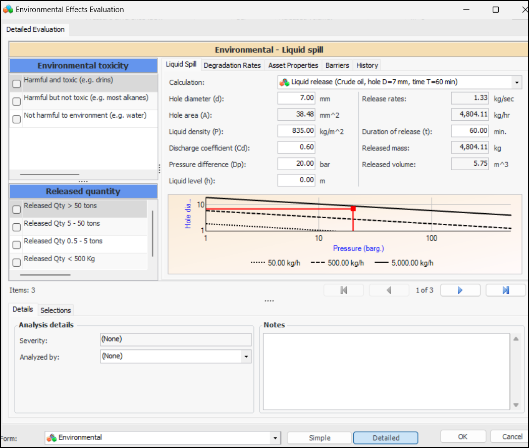The analyst clicks Environmental to open the questionnaire:Tip: Evaluations can also be shown as “embedded” forms, meaning that the user opens the Maintenance Action Plan window, selects the Risk tab, and then selects options. This choice can be set in the risk options for the analysis, analysis type, or asset type.The analyst can refer to the Asset Properties, History, and Barriers tabs for information to aid in the evaluation, for example, historical inspections, failures, and work performed. APM provides this information automatically, based on the asset’s data. When designing the evaluation, you can add the Samples tab and provide examples. You can also choose to show asset fluid information, degradation rates, and calculations (Liquid release or flash calculation for LPG).If different evaluation types have been defined in the form, the analyst can select Simple or Detailed, as required by the complexity of the failure mode.As the analyst moves through the analysis, the Severity box displays the current calculation of severity based on the selections. The Selections tab displays the categories, selected statements, and the ranking.The analyst can select the team member performing the evaluation from the Analyzed by list and provide additional information about the analysis in the Notes box. Notes are collected and available in several locations.When the analyst completes the pop-up questionnaire and clicks OK, the evaluation form closes and the result (for example, slight effect or major effect) is selected in the risk matrix. For example:To Set up an Environmental Evaluation
