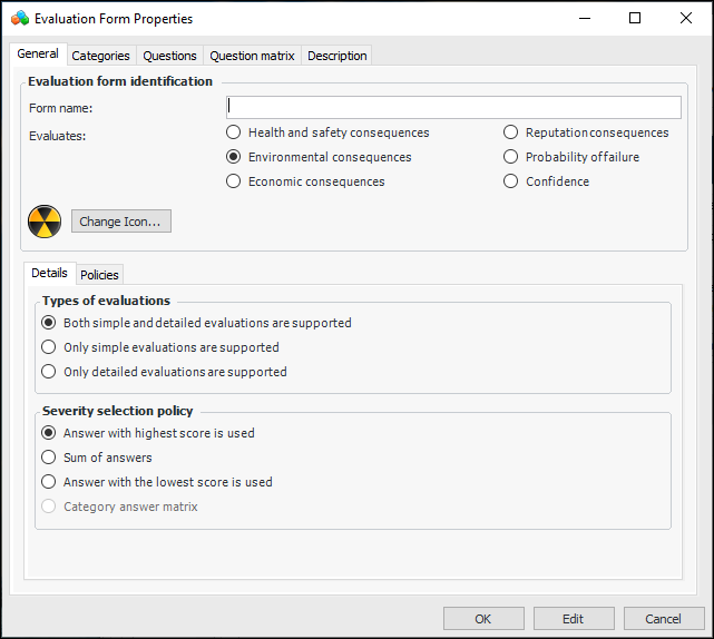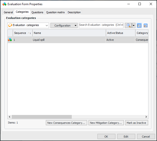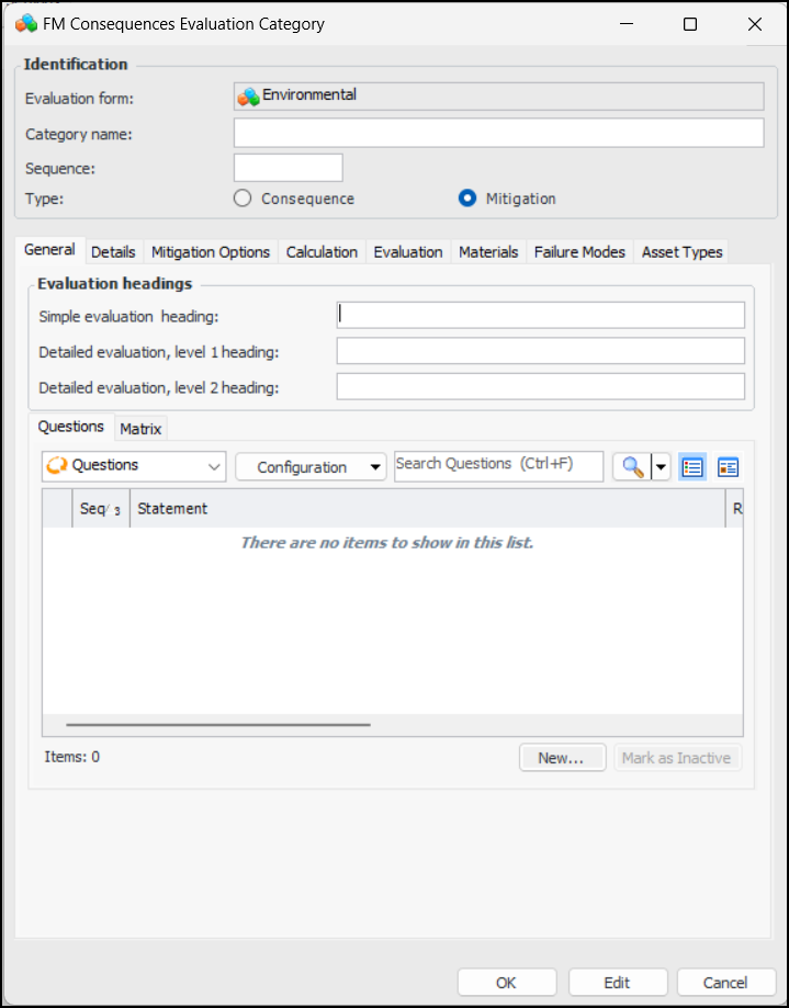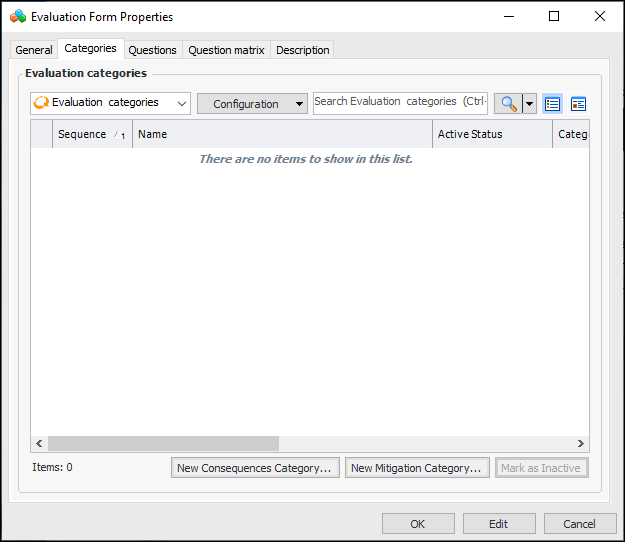 1. In the Evaluation Form Properties window, select the Categories tab. Click New Mitigation Category. The FM Consequences Evaluation window appears.