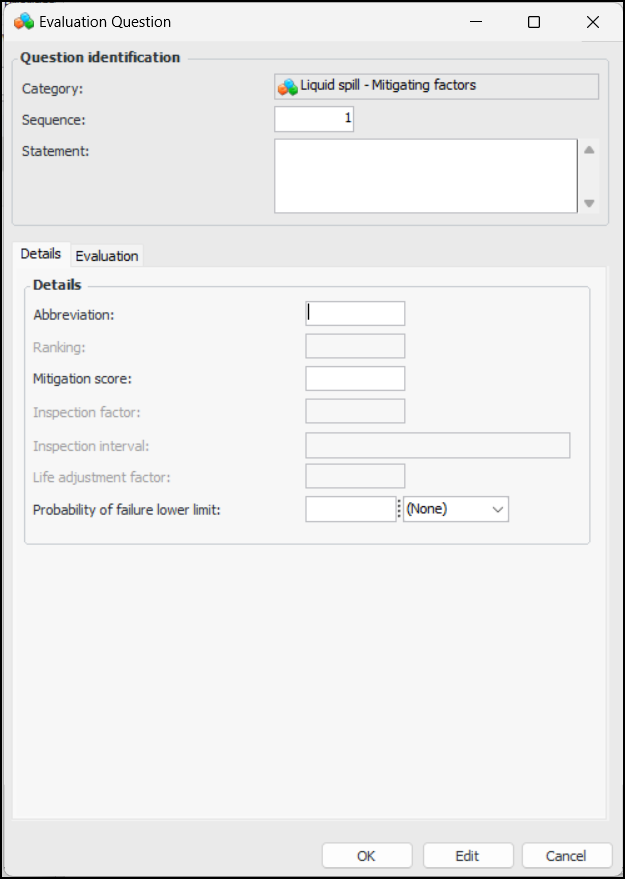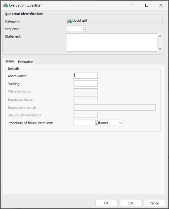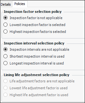 • Longest inspection interval is used – The selected statement with the longest inspection interval supplies the inspection intervalTo Create Consequence Categories and Questions