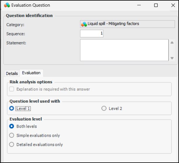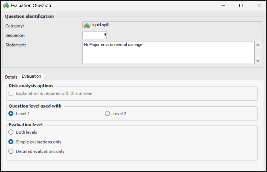 When designing an evaluation, you can specify that it supports simple evaluations (one level of questions), detailed evaluations (one or two levels of questions), or both. When two levels of questions are defined, the first set usually presents the problems and the second set presents the volume or size of the problem. For the Fire category, for example, first-level questions could deal with flammability and second-level questions with the volume of released fluid. When the evaluation supports both levels, the user can click Simple or Detailed in the questionnaire, depending on the complexity of the failure mode.Category Answer Matrix