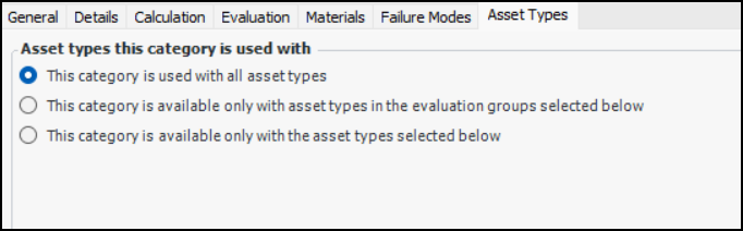 19. Select the Asset Types tab to restrict the category to specific asset types or asset types in specific evaluation groups.
