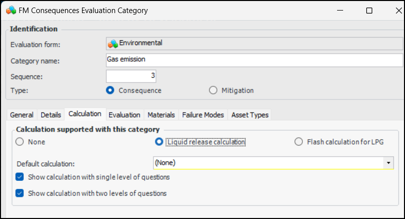 15. Select the Calculations tab if you wish to show a liquid release or gas spill flash calculation with the category.Note: APM provides liquid release and sample flash calculations. To create or edit calculations, select the Strategy Development view and then the Settings, Severities, and Calculations tabs. Click New to create either a liquid release calculation or a flash calculation for LPG.