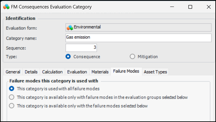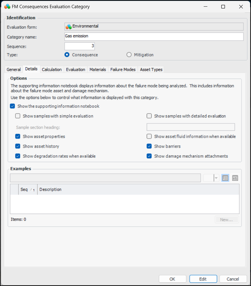 12. On the FM Consequences Evaluation Category dialog, select the Details tab to set options for supporting information. For example: