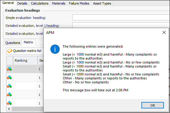 10. If the evaluation supports detailed forms, select the Matrix tab. Click Generate. APM displays a message listing the entries that were generated. For example:
