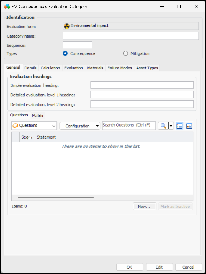2. Click New Consequences Category. The FM Consequences Evaluation Category window appears.Note: For information about creating a mitigation category, see To Create Mitigation Categories and Questions.