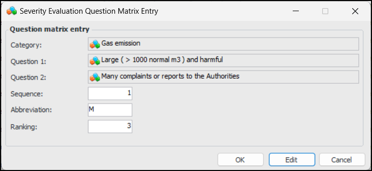 11. Click OK to close the message. Double-click each entry in turn to open its Severity Evaluation Question Matrix Entry dialog. For example:
