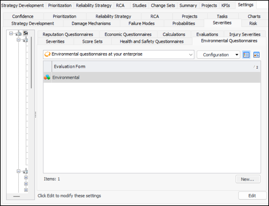 13. When you have finished adding categories, click OK. The form is added to the Environmental Questionnaires tab.