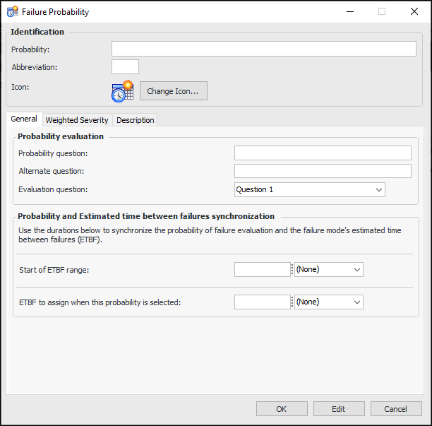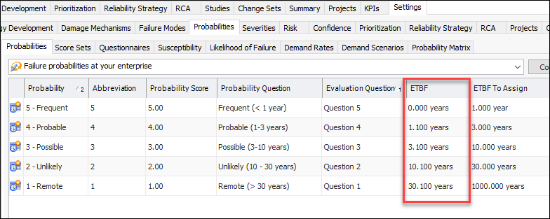 • Probability of failure evaluation options can be set for each of the analysis types. For example, you can specify that, for RCM2 analyses, probability of failure can be based on estimated time between failure (ETBF) without maintenance or completed evaluation forms. You can make both of these processes available so that analysts can select one based on the requirements of a particular failure mode. For more information, see Setting Risk Analysis Options for Analysis Types.When using ETBF to perform risk analysis on a failure mode, you can enter the estimated time between failure on the Criticality tab. If the TBF is greater than any of the ETBF values, the largest ETBF is selected as the probability of failure score.To Set up a Failure Probability