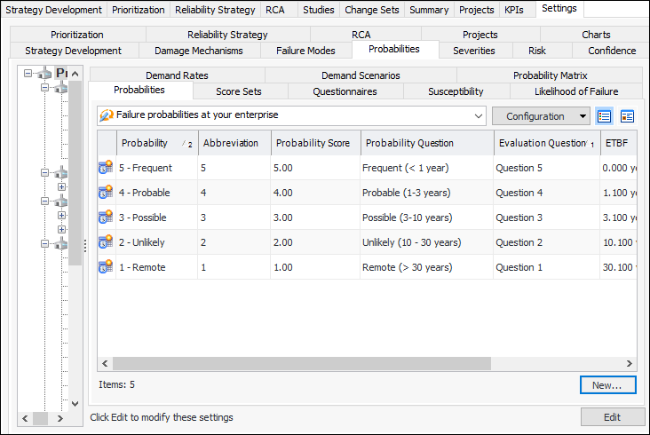 1. From the Site window, select the Strategy Development view, Settings tab and then the Probabilities tab. Select the Probability of Failure Settings node in the tree.Tip: You can also select the Administration menu, Strategy Development Settings, Risk Analysis, and then Probabilities. The Strategy Development - Probability of Failure Settings dialog appears.