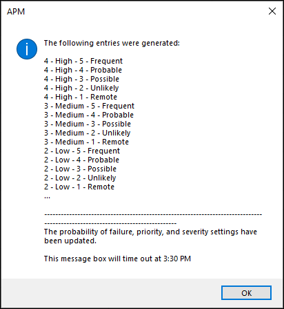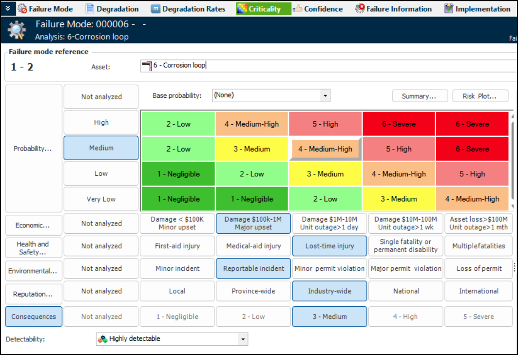 • On the strategy development analysis, ensure that the risk options include Default the action plan strategy and frequency from the risk matrix.If your APM environment is configured to use AssetWise Enterprise Interoperability and anomaly risk assessment and integration, you must create or edit a risk matrix to work with anomaly risk assessment. For more information, see Setting up APM for Anomaly Risk Assessment and Integration.To Set up a Risk Matrix