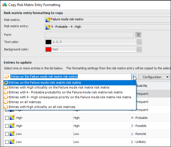 9. Click OK to close the Risk Matrix Entry dialog.To Copy Formatting Between Entries