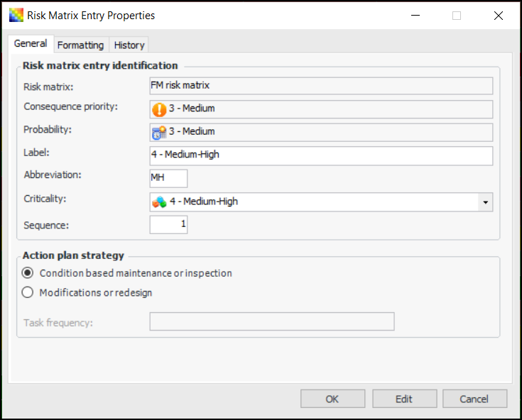 7. If specified in the risk matrix options, the action plan strategy options are available. The strategy you select here is chosen as the recommended task in the action plan. If you select Condition based maintenance or inspection, you can also choose a task frequency.