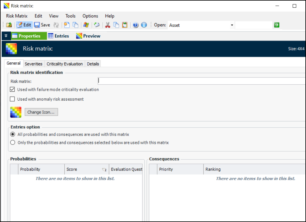 1. In the Entries view and tab, double-click an entry or click New. The Risk Matrix Entry Properties dialog appears. For example:
